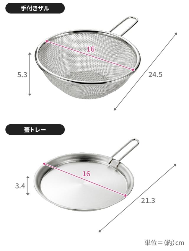 | [ボウル]約幅15.5×奥行24.5×高さ6.5cm [手付きザル]約φ16×22.8×5.3cm [蓋トレー]約φ16×21.3×3.4cm [レザーカバー]約幅4.5×奥行11×高さ0.3cm |
