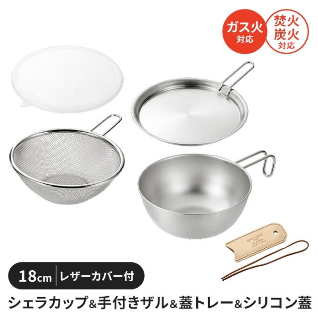 【値下げ】シェラカップ・ボウルセット 18cm 手付きザル 蓋トレー シリコン蓋 レザーカバー ステンレス製 直火 コンパクトキャンプ用品
