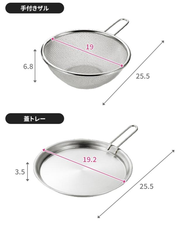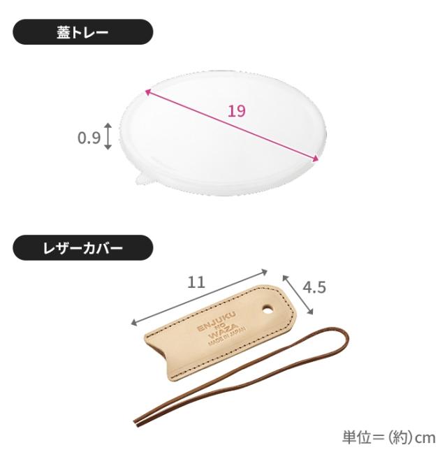 | [ボウル]約幅15.5×奥行24.5×高さ6.5cm [手付きザル]約φ16×22.8×5.3cm [蓋トレー]約φ19.2×25.5×3.5cm [シリコン蓋]約φ19×0.9cm [レザーカバー]約幅4.5×奥行11×高さ0.3cm |
