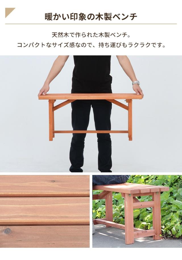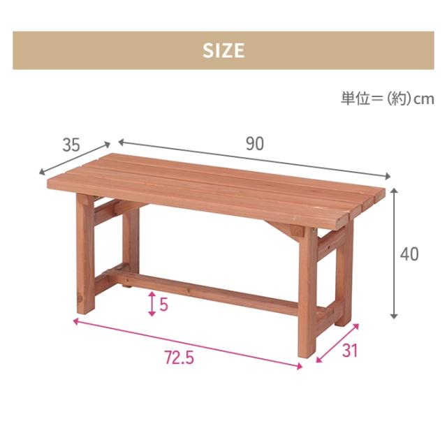 | あたたかみのある木製ベンチ 幅90cm。 肌触りのよい天然木・杉材を使用しています。 軽いので持ち運びもラクラク。 |