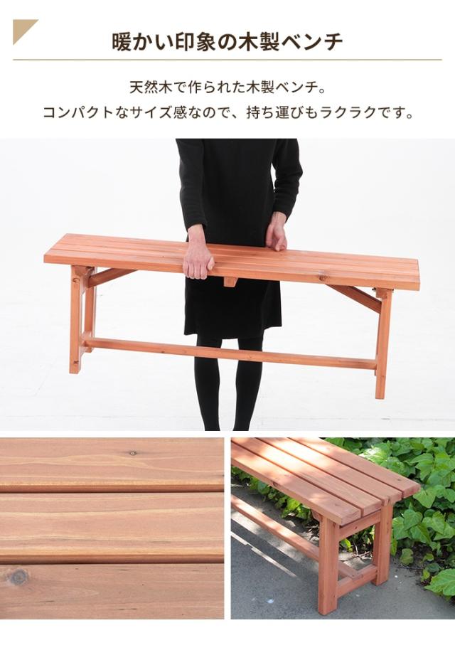 | あたたかみのある木製ベンチ 幅120cm。 肌触りのよい天然木・杉材を使用しています。 軽いので持ち運びもラクラク。 |