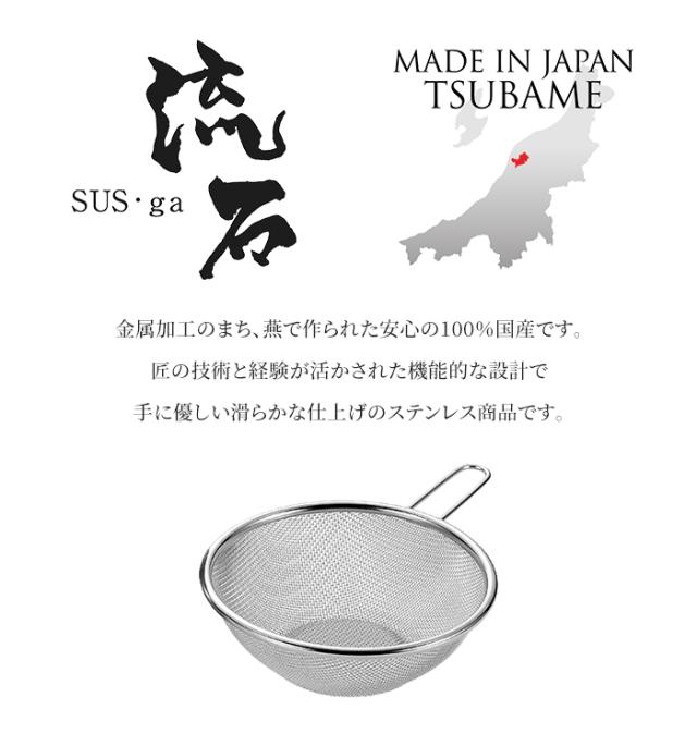 | 機能的な設計と手に優しい滑らかな仕上げ。 匠の技術と経験が生かされた調理の必需品。 安心の100%国産! 金属加工のまち、燕で作られたメッシュザルです。 底部の足は一体成型で水切れが良く洗いやすく、外れる心配もなく丈夫です。 通常より太い線材を使用し1インチ(2.54センチ)の中に16メッシュで強度をアップしています。 細かいアミ目でそうめんなど細い食材が抜けにくく、野菜の水切りなどで重宝いたします。 |