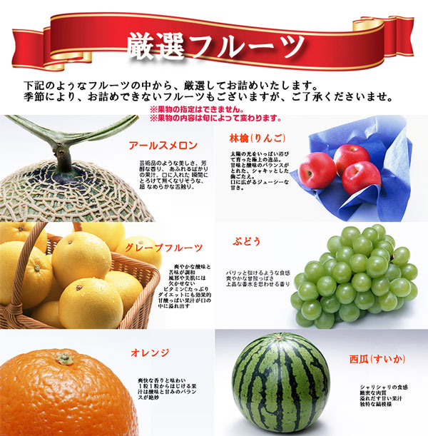 | 内容量 | 青果市場厳選・旬のフルーツ詰合せ 段ボール化粧箱 ※内容は指定できません。 |