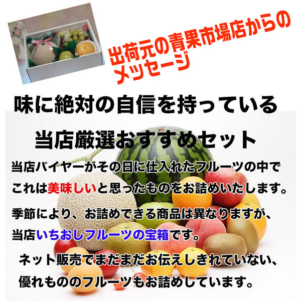 ■青果市場からのメッセー: 季節に応じて、厳選した旬のフルーツを8〜10点程度お詰めいたします。荷姿:約3kg※こだわりバイヤーに一任していただく商品になります。