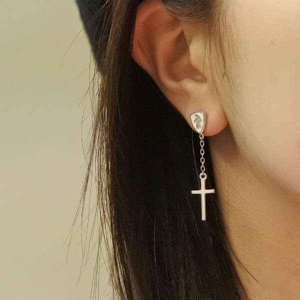 チェーンからクロスが揺れるチェスナイトエンブレムピアス。