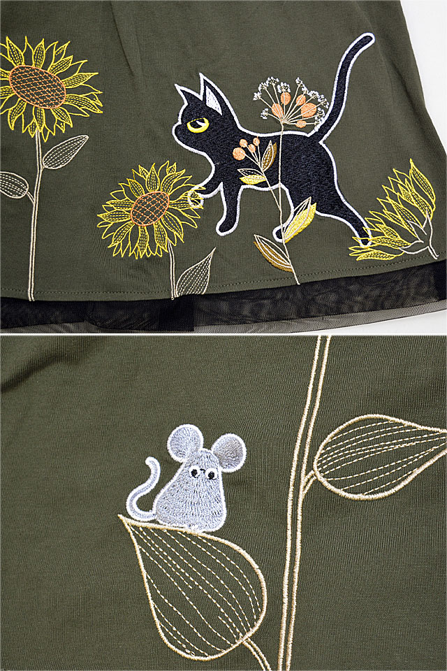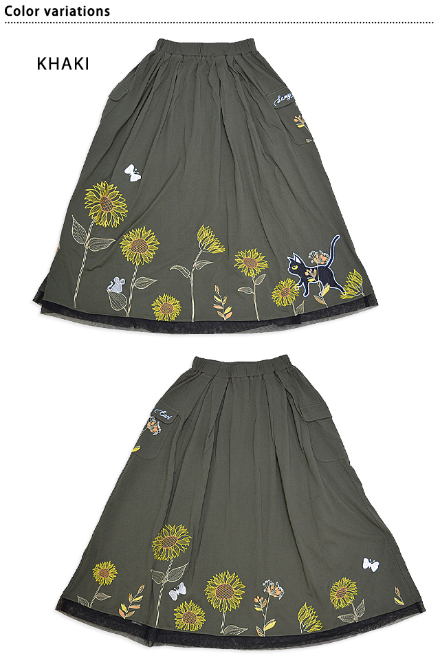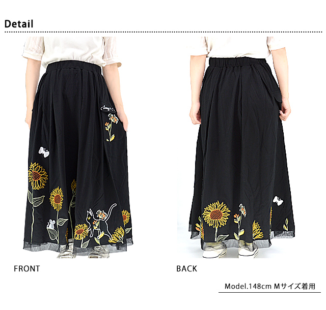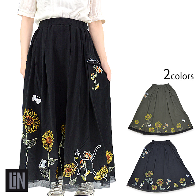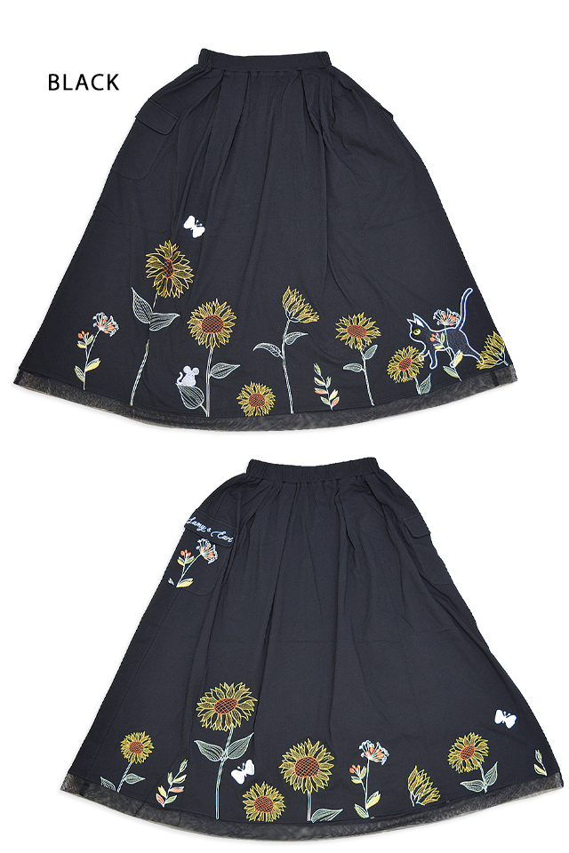 ラミ&アール 向日葵満開スカート LIN レディース AL-75733 黒猫 ねこ 鼠 刺繍 ひまわり
