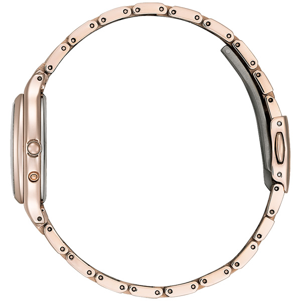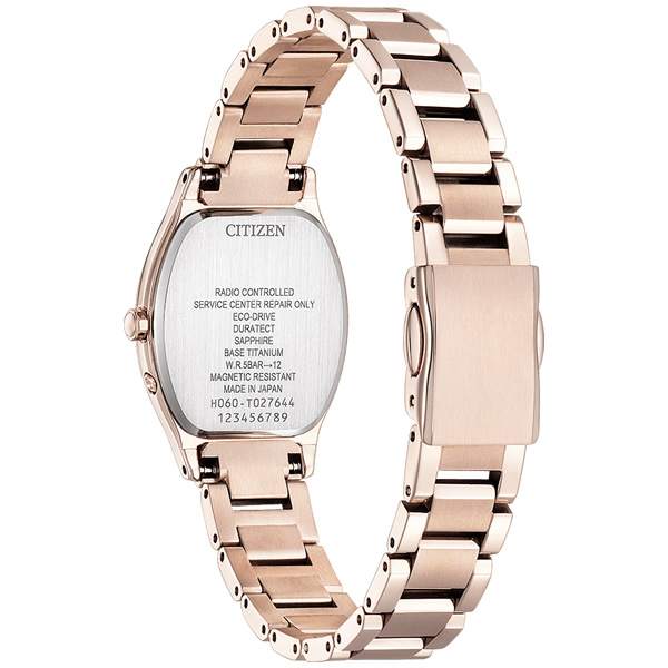 光を感じさせる柔らかいホワイトダイヤルに、煌めくパール調のデザインが手元を動かすたびに美しく輝きます。優美な印象のローマフォントもポイントです。4時と5時の間にあるTYO位置には煌めく光のマークが女性心をくすぐります。シチズンだけのサクラピンクが上品で美しい印象を引き立てます。