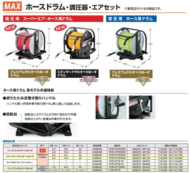 〇 マックス ホースドラム プレミアムやわすべりほーす HHD-RT6030S2 AH96489 高圧用エアホース 内径6.0mm 長さ30m MAX 。