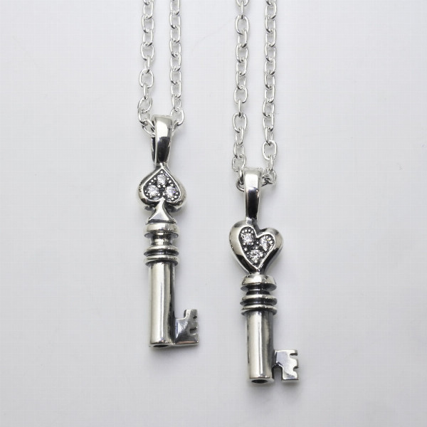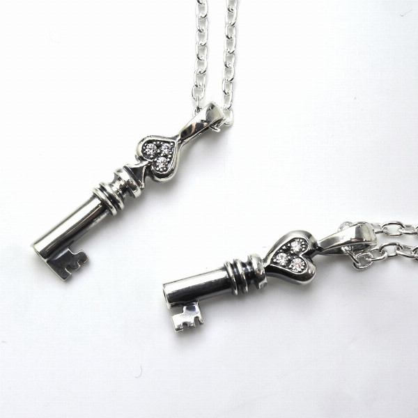 スペードキー、ハートキーのネックレス。神秘・解放の象徴とされる鍵をモチーフにし、幸せの扉を開き健康や富を呼び込むネックレスとなるよう想いを込めて。2つある鍵のトップには、力を司る意味合いを持つスペードと愛を司るハートをヘッド部分にデザインしており、より深い意味合いを持たせております。モチーフにキラリと輝くストーンがアクセント。スペードは50cm、ハートは40cmのチェーン付属でペアネックレスとしても楽しめるアイテムです。