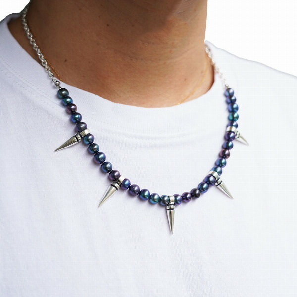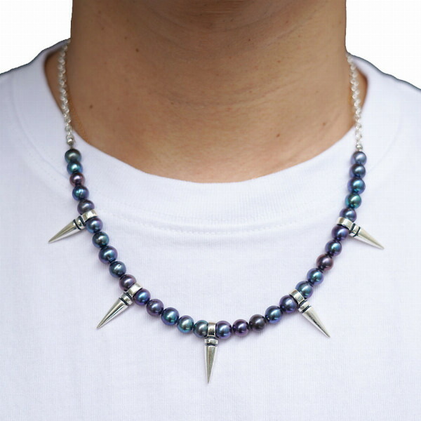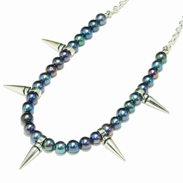 PUERTA DEL SOL パンク ロック スタッズ パール 真珠 ネックレス(チェーン付き) ブラック シルバー950 ユニセックス シルバーアクセサリー 銀 SV950