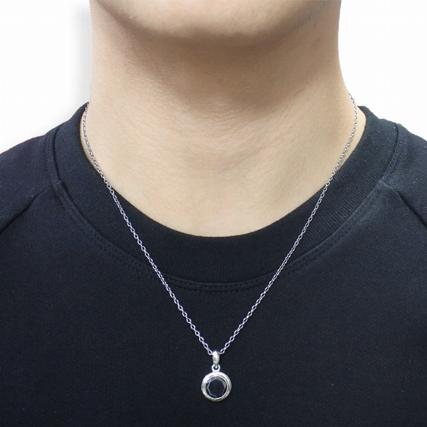 ヘマタイト、オニキス、ホワイトオニキスをセットしたサークルペンダント。ベーシックで立体的なフォルム、裏面のハート型の窓からは石に刻まれたナイトが見えます。