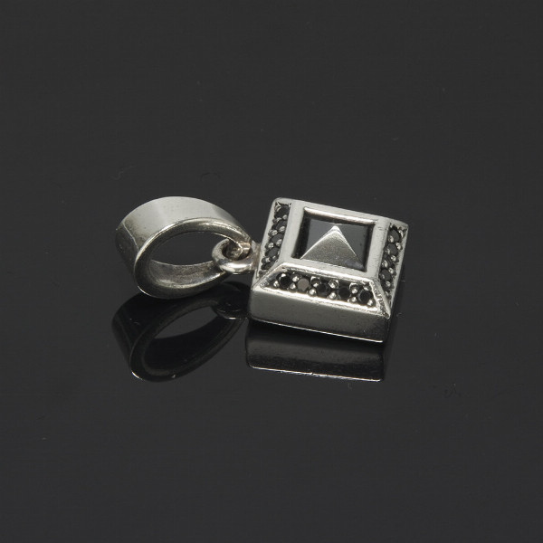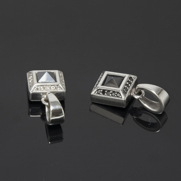 ヘマタイトスタッズをダイヤモンドorブラックダイヤモンドで縁取り、複数の直線で仕切られた立体的なフェイスのラグジュアリーな存在感を放つペンダントトップ。