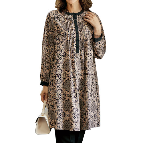 配色使いピンタックデザインチュニック ベージュ チュニック クルーネック レディース 婦人服 ミセス シニア 女性 長袖 プリント柄 上品 フェミニン クラシカル レトロ かわいい シニアファッション 40代 50代 60代 70代 80代 母の日 お母さん