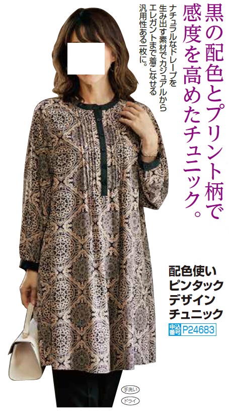 配色使いピンタックデザインチュニック ベージュ チュニック クルーネック レディース 婦人服 ミセス シニア 女性 長袖 プリント柄 上品 フェミニン クラシカル レトロ かわいい シニアファッション 40代 50代 60代 70代 80代 母の日 お母さん 秋冬 nss p24683