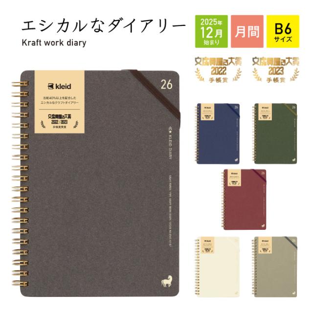 2026 手帳 ダイアリー Kraft work diary B6 2026年 手帳 かわいい 文房具屋さん大賞 SDGs kleid クレイド ダイアリー B6 マンスリー クラフト紙 スケジュール帳 2mm方眼 チャコール ネイビー オリーブドラブ バーガンディー キャメル ホワイト 258265