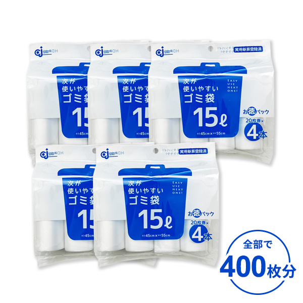 次が使いやすいゴミ袋(お得パック) 15L 4本(80枚分)×5個セット HDR-15L-4 | ごみ袋 ロール ポリ袋 半透明 ビニール袋 15L ミシン目カット 次が出てくる かさばらない コンパクト ラクに交換 使い捨て 消耗品