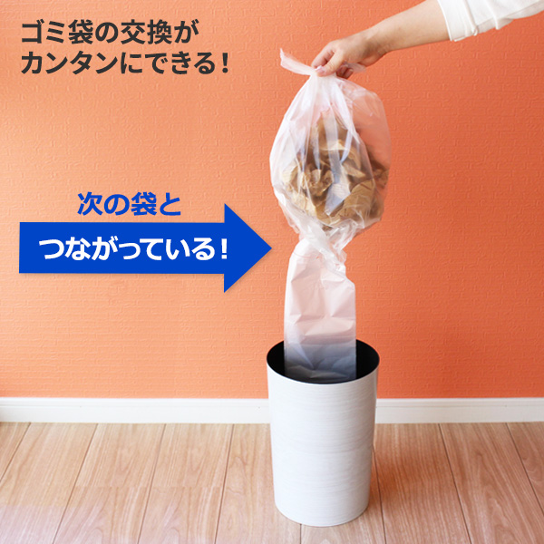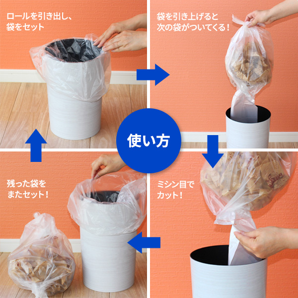 つながったままゴミ箱にかけて使用する袋で、取り替え時に新しいゴミ袋を用意しなくていいのでラクラクです。