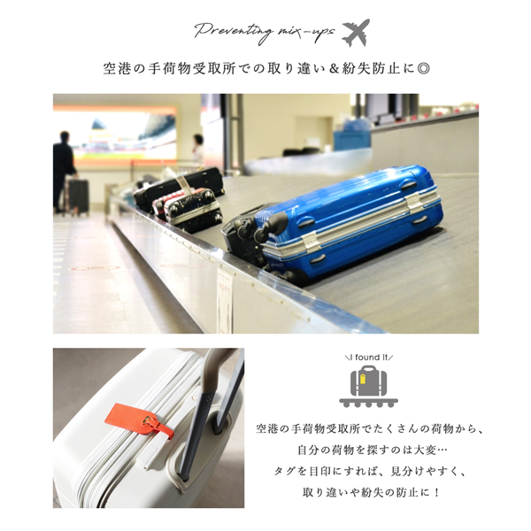 空港の手荷物受取所での取り違いや紛失防止に、くるっと巻いて穴に通すだけ。