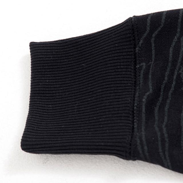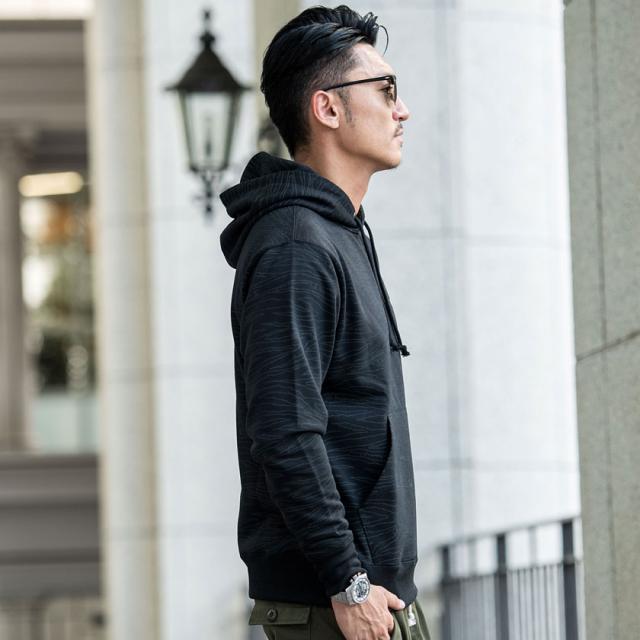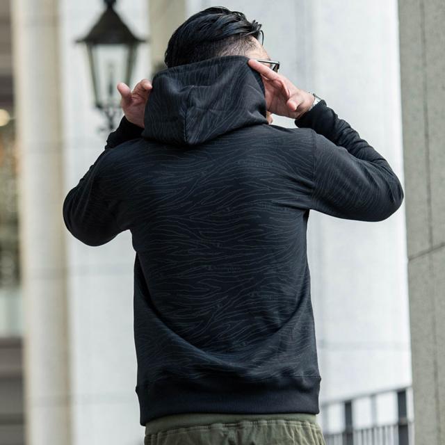 環境に配慮されたリサイクルポリエステル100%で、従来のコットン100%に比べて形状安定性、速乾性に優れた生地を使用した総柄プリントのフーデッドスウェットシャツです。