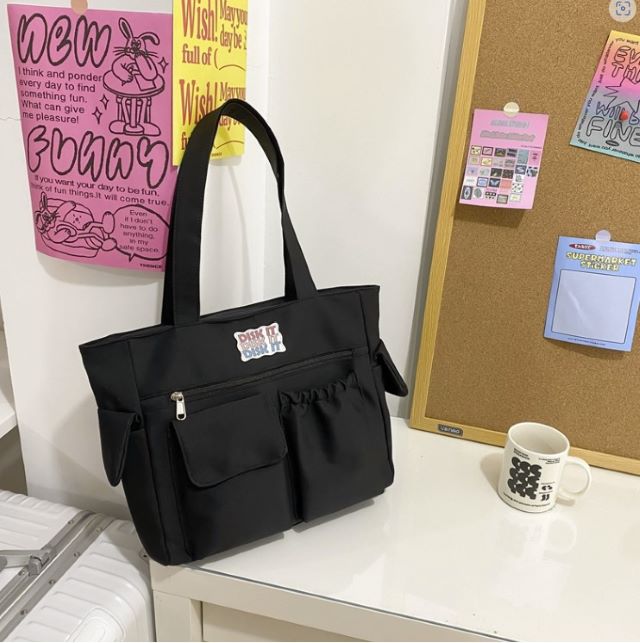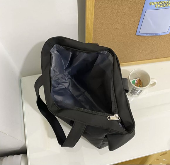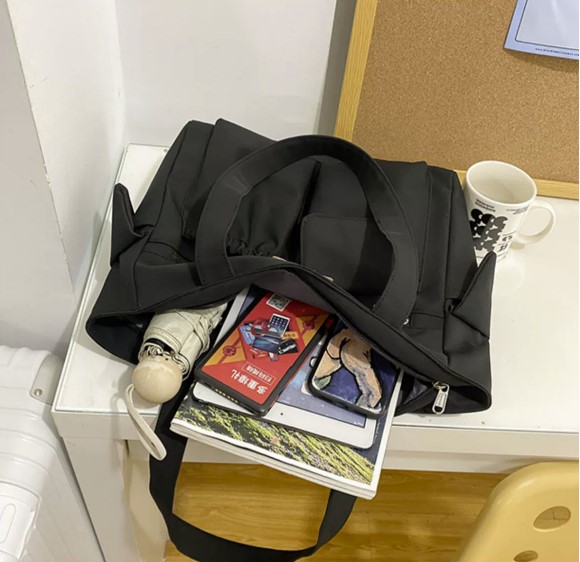 持ち方でフォルムが変わるナイロントートバッグ。布製のチャック付き、大きめの肩掛け布トートバッグ。a4サイズのテキスト、書類などの収納が可能。
