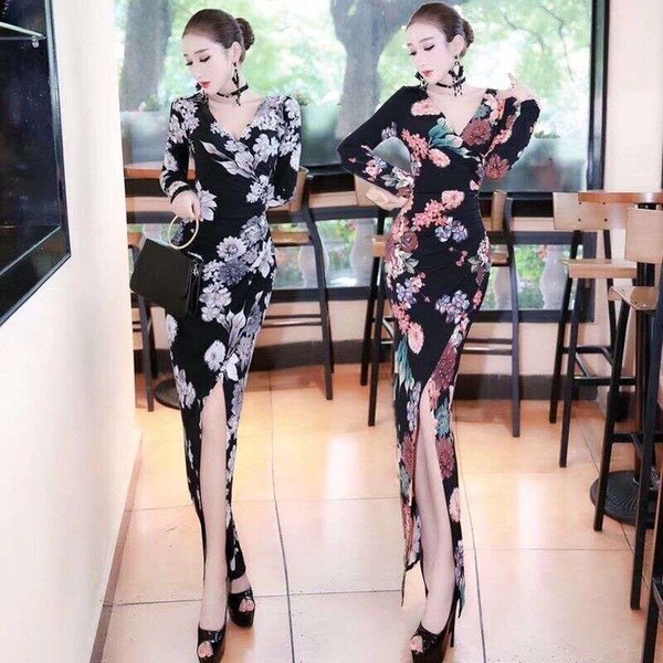 和柄デザインがエレガントなロングドレス ロングドレス キャバドレス キャバワンピ 深めのスリットが視線浴びまくり ストレッチロングドレス ナイトワーク キャバクラドレス 和柄ドレス