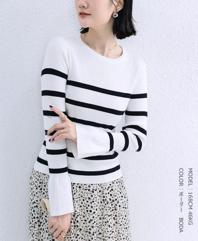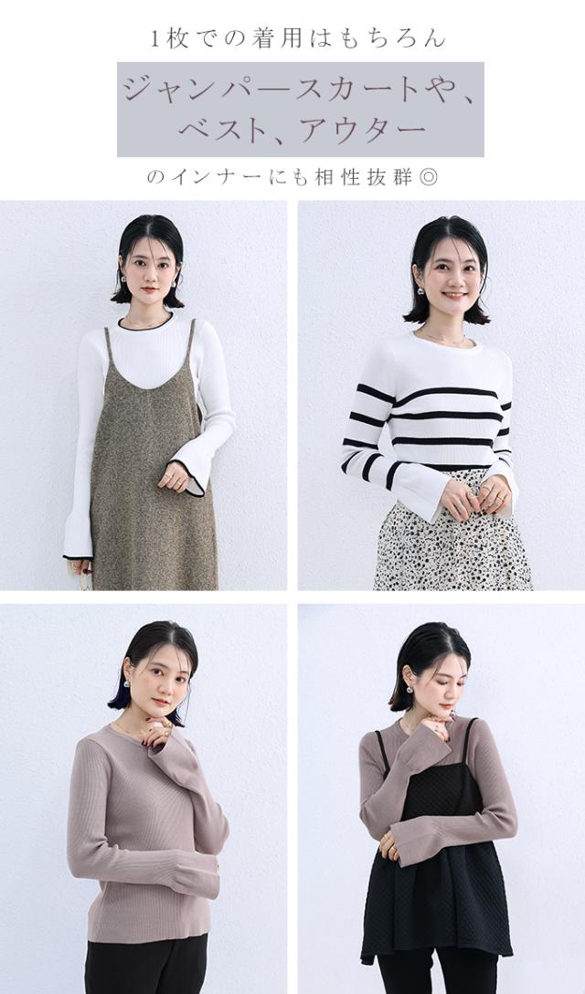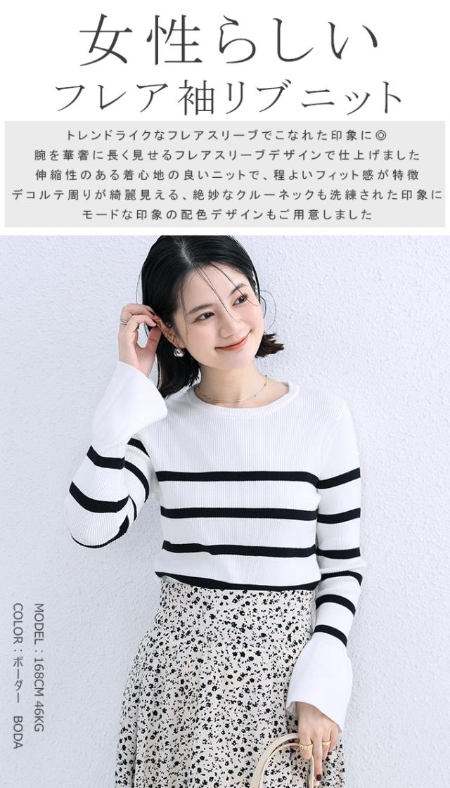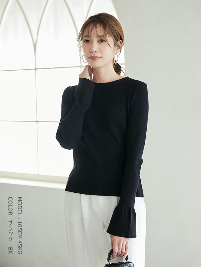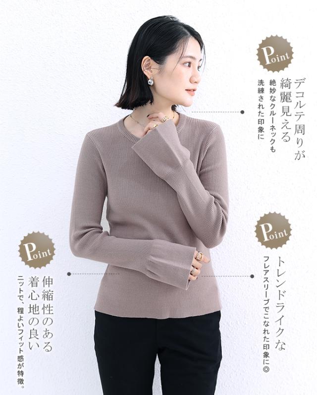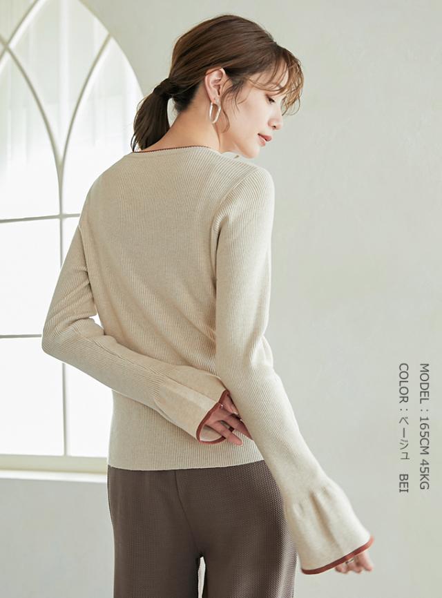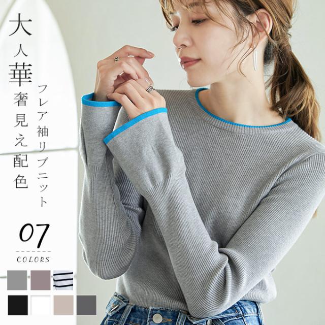 50%OFF、1990円リブニット フレア袖 ニット 春 フレアスリーブ バイカラー ニットソー ニットトップス レディース リブ Uネック ラウンドネック 着痩せ 華奢見え きれいめ シンプル 細見え 大人