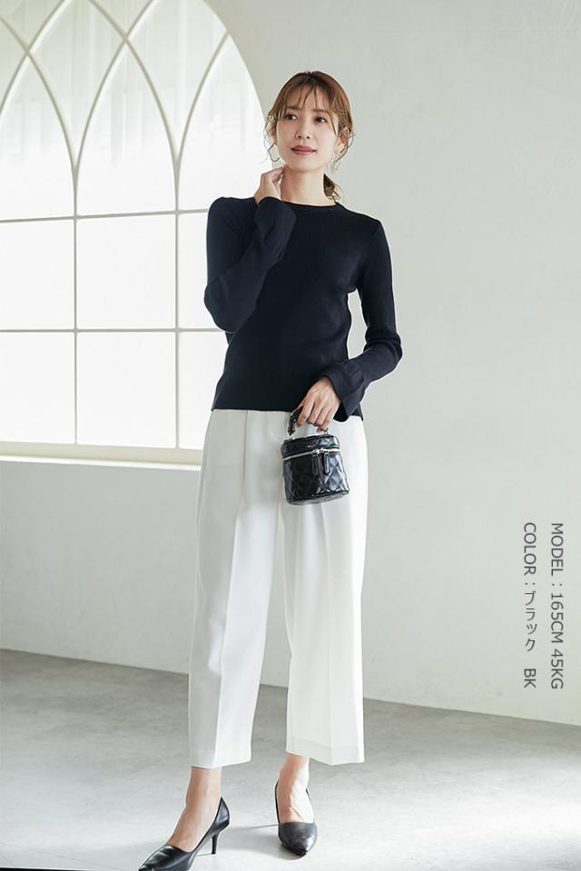デコルテ周りが綺麗見える、絶妙なクルーネックも洗練された印象に。