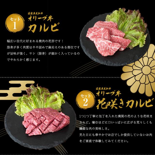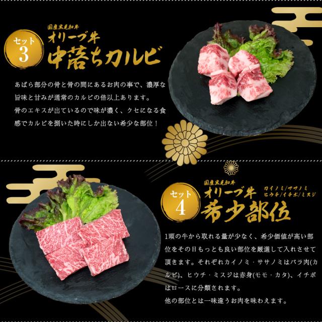 ◆名称・部位:オリーブ牛ロース(ロース/リブロース/カタロース/ロースカブリ)・カルビ・花咲きカルビ・中落ちカルビ・希少部位(カイノミ/ササノミ/ヒウチ/イチボ/ミスジ)・赤身部位(モモ/ランプ/マル/ウチヒラ/カタ)・国産和牛カルビ