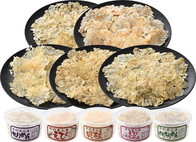 | 【1】そのまんまちりめん 瀬戸内海を中心とした国内産のチリメン(カタクチイワシ稚魚・しらす)を、特殊な温度と圧力で花びらのように一枚一枚丁寧に焼き上げ!添加物等は一切不使用で歯触りはサクッとしていながら、口の中でしっとりとし食感をお楽しみ頂けます。おにぎりやサラダ、卵かけご飯や納豆等、素材の味を活かし様々なお料理に活用頂けます。また、お子さまのおやつとしても人気でカルシウム不足に陥りがちな方にもお勧めです♪ 【2】そのまんまえび しっかり味が付いているエビを、特殊な温度と圧力で花びらのように一枚一枚丁寧に焼き上げ!添加物等は一切不使用で歯触りはサクッとしていながら、口の中でしっとりとした食感とエビの風味をお楽しみ頂けます。薄いせんべいなのにエビ本来の味をしっかりと感じることが出来るため、お子様のおやつはもちろん、お酒のおつまみにもピッタリです♪ 【3】そのまんま貝柱 味の濃いイタヤ貝(貝柱)を、特殊な温度と圧力で花びらのように一枚一枚丁寧に焼き上げ!添加物等は一切不使用で歯触りはサクッとしていながら、口の中でしっとりとした食感をお楽しみ頂けます。貝柱の味が濃いためお酒のお供しても人気です♪ 【4】そのまんまえびちりめん 国内産のチリメン、エビ(アキアミ)、オキアミを絶妙なバランスでミックス!食品添加物やつなぎなどを一切使わず、サクッとしっとりとした食感と、磯の風味豊かな味わいが特徴の一品に仕上がりました♪ 【5】そのまんまのりちりめん 国産ちりめんと国産干し海苔のコラボ—レーション。食品添加物やつなぎなどを一切使わず、サクッとしっとりとした食感と、磯の風味豊かな味わいが特徴の一品に仕上がりました♪ |
