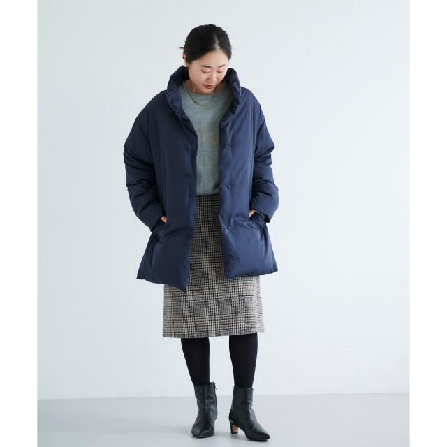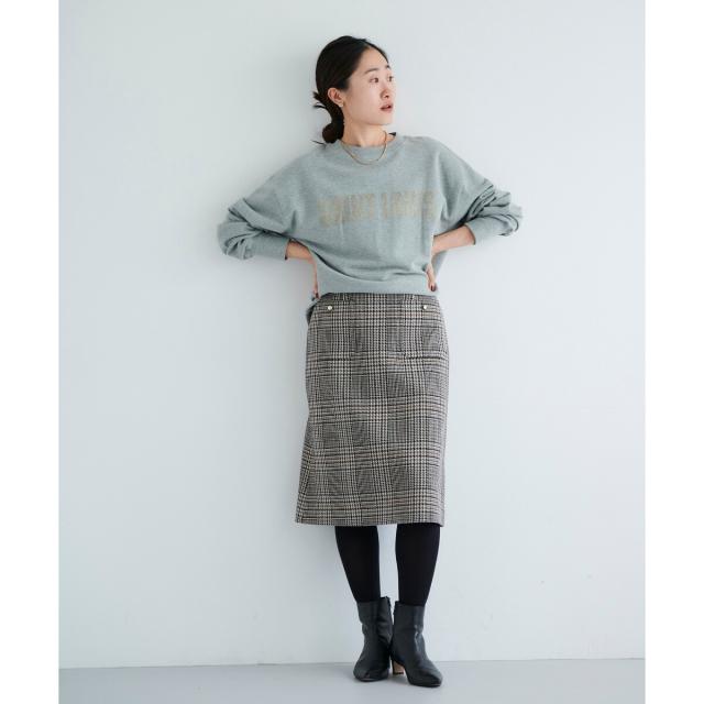 シンプルなひざ下の丈感と、裾にかけて程よく広がるトラペーズシルエットが、脚のラインをきれいに見せてくれます。厚みのあるウール混の素材なので、体のラインを拾わずにスッキリと着て頂けます。ウエスト口のパイピングやフロントのメタルボタンなどトップスインでも様になるデザイン。