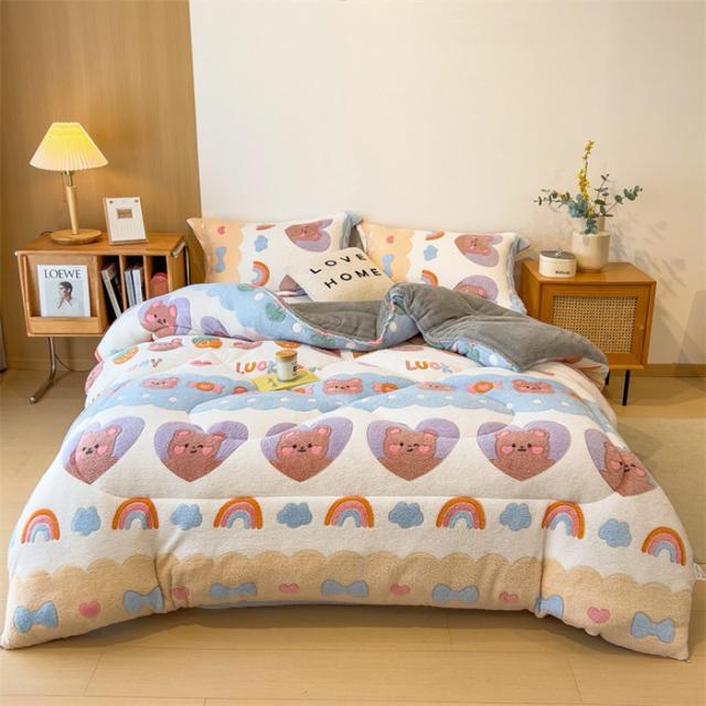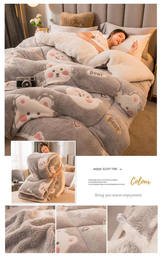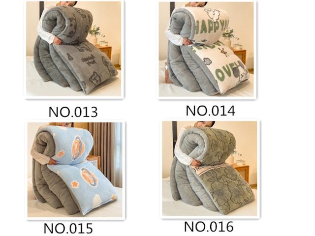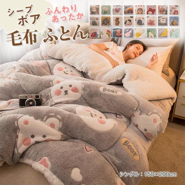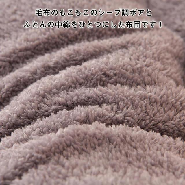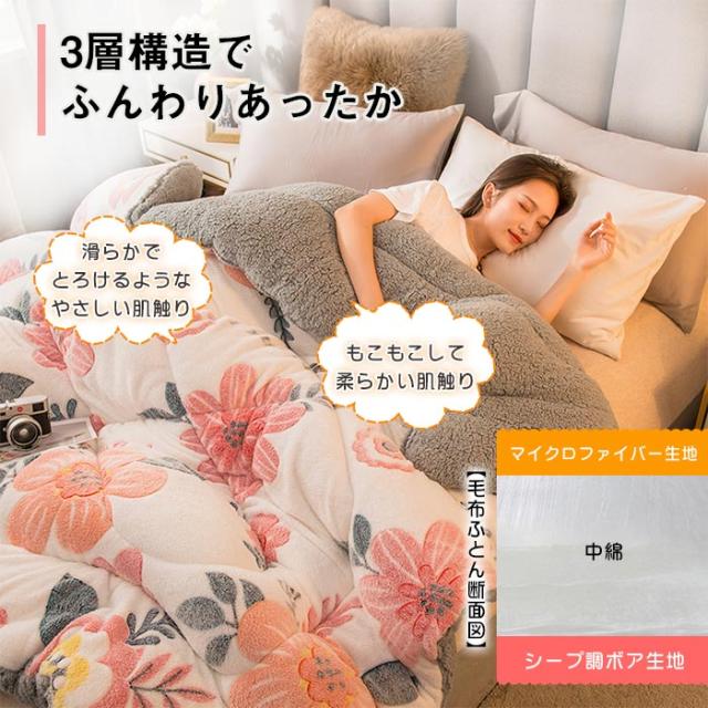 【三層構造毛布ふとん】(表地)なめらかでとろけるようなやさしい肌触りがフランネル生地、(中綿)吸湿発熱のポリエステル中空綿、(裏地)身体に触れる裏面がもこもこのシープ調ボアを採用しております。まるで羊に触っているような手触りでふわふわやわらかいです。布団に入る際の冷感はなくて、体はすぐ暖かくなるのは魅力です。