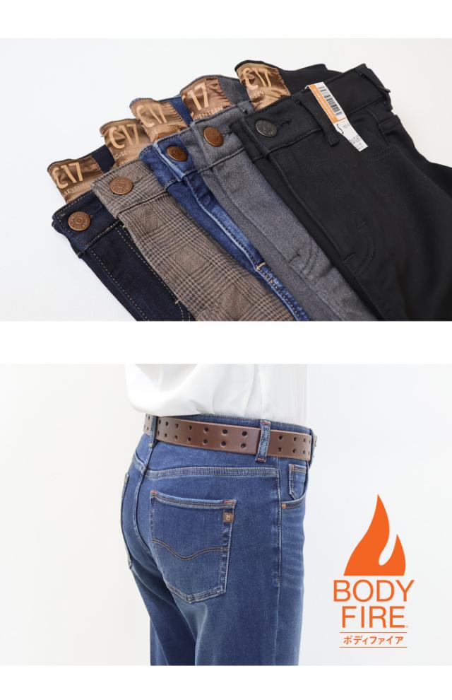 C-17から毎年定番のあったか美脚ストレートが登場しました♪ 吸湿発熱、保温性機能を備えた素材なので、身体の湿気に反応してずっと暖か。穿いた瞬間からやさしく暖かく感じ、抜群のストレッチ性と程よいホールド感と裏微起毛で暖かさと肌ざわりの良さを感じる冬の美脚ジーンズです。シルエットは股上が普通で、ヒップから太もも、ヒザまでは程よくフィットし、スソにかけて、ほんの少し広がりを持たせた美脚ストレートタイプです。