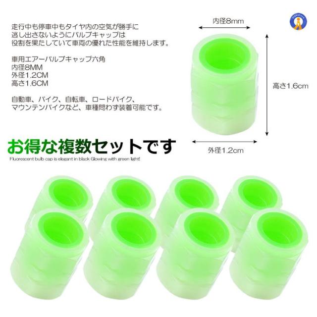 バルブキャップ 8個セット 蛍光 車 仏式 タイヤ グリーン エアバルブキャップ ホイール 軽量 自転車 バイク 光る 蓄光 緑 M8 六角 汎用 夜光 8-KEIBARU