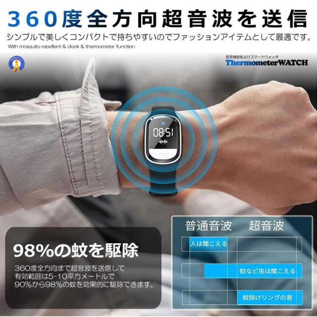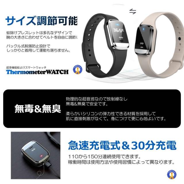 2個セット 超音波ブレスレット 多機能 蚊よけ スマートウォッチ 超音波 腕時計 温度計 防水性能 クロック 3段階調節可 USB 充電 虫よけ 肌対策 畑 庭 ガーデニング おしゃれ かわいい ONBRES