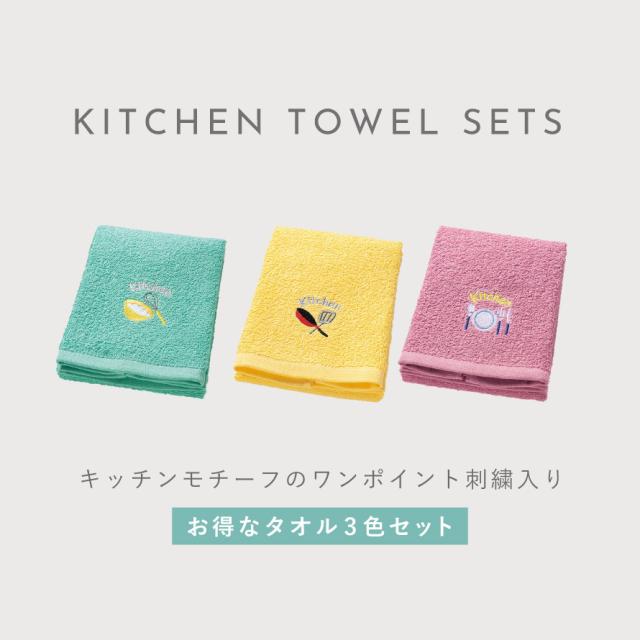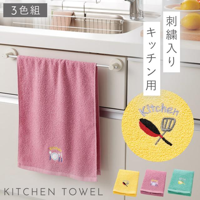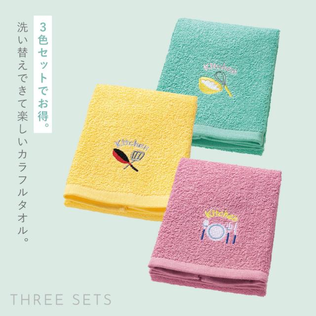 キッチン 手拭き タオル 3枚組 セット 刺繍 キッチンタオル 洗い替え おしゃれ キッチン用タオル3色組 ハッピーライフ