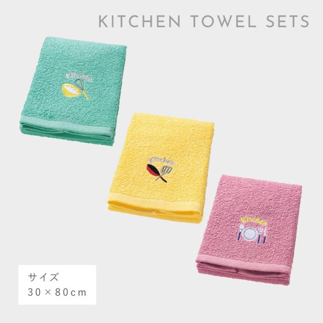 タオル,手拭き,キッチン,3枚組,セット,手拭きタオル,30×80cm,刺繍,キッチン用,台所,台所用,洗い替え,おしゃれ,お洒落,オシャレ,かわいい,可愛い,シンプル,自宅用,家庭用,家族,ファミリー,