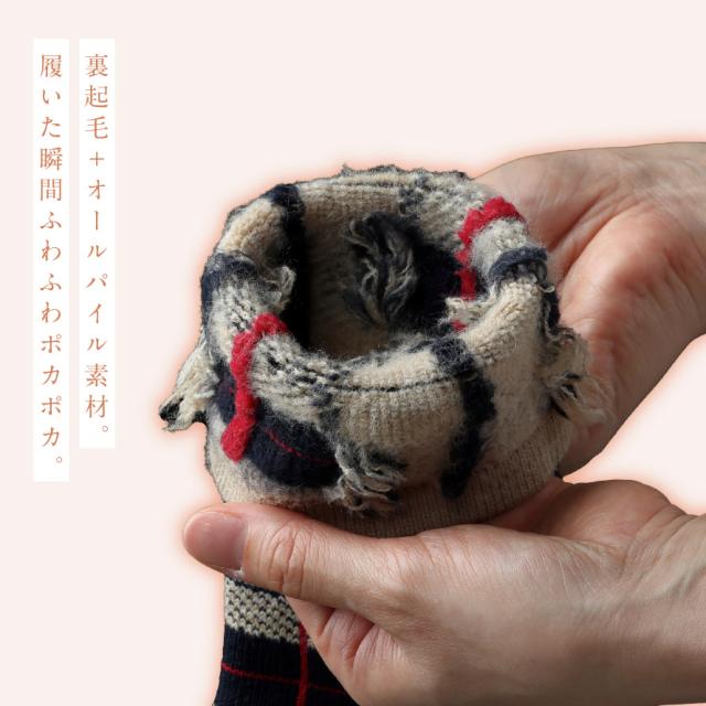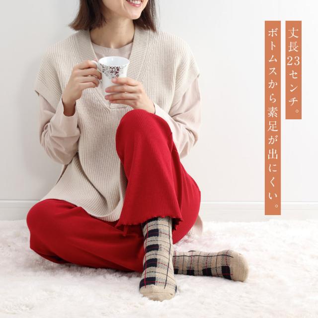 裏起毛でふんわりポカポカ。オールパイル素材で保温性・クッション性のある、一度履いたらやめられない履き心地のあったかソックス。冬の定番のチェック柄。上品で可愛らしいカラーは秋冬コーデとも相性◎、アクセントにも。