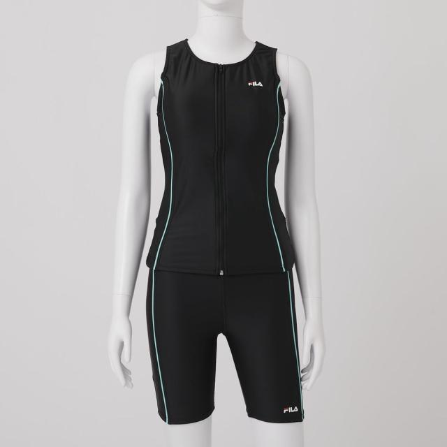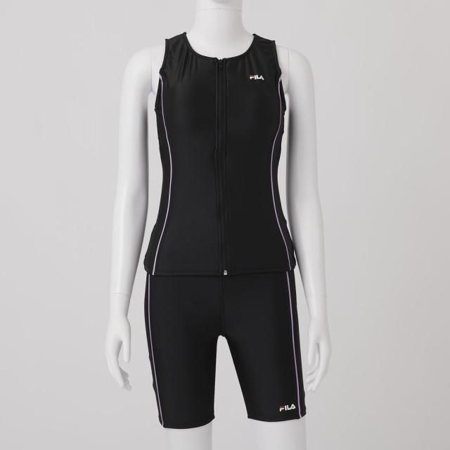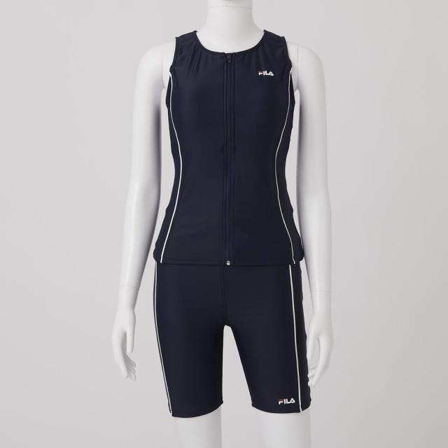 ●シンプルなファスナー開閉のセパレーツ水着。脇に3mmのカラーラインが入っています。胸にFILAのロゴプリント。胸裏部分は挿入式のカップが付いていて、お好きなカップに入れ替えも可能です。パンツ前部分全体にも胸部分と同じ伸びの良い裏地をつけています。トップスがめくれ上がりにくい仕様です。ウエストは内側の紐で調節できます。