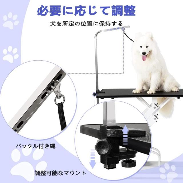 【頑丈で安全な構造】この犬のグルーミングテーブルは、最大150kgの耐荷重を持つ頑丈なスチールフレームで作られています。 犬のテーブルトップは、すべての子犬、中型犬、大型犬に適した頑丈なベースで支持されています。ミニチュアプードルシュナウザーポメラニアンサモエドパピヨンなど、