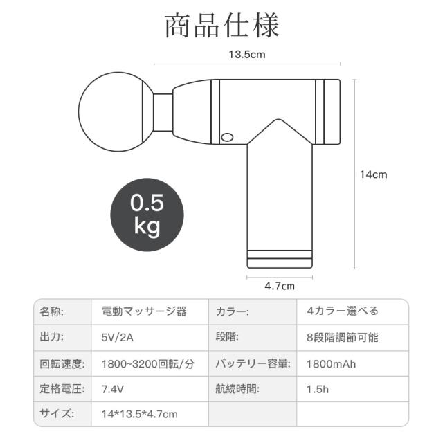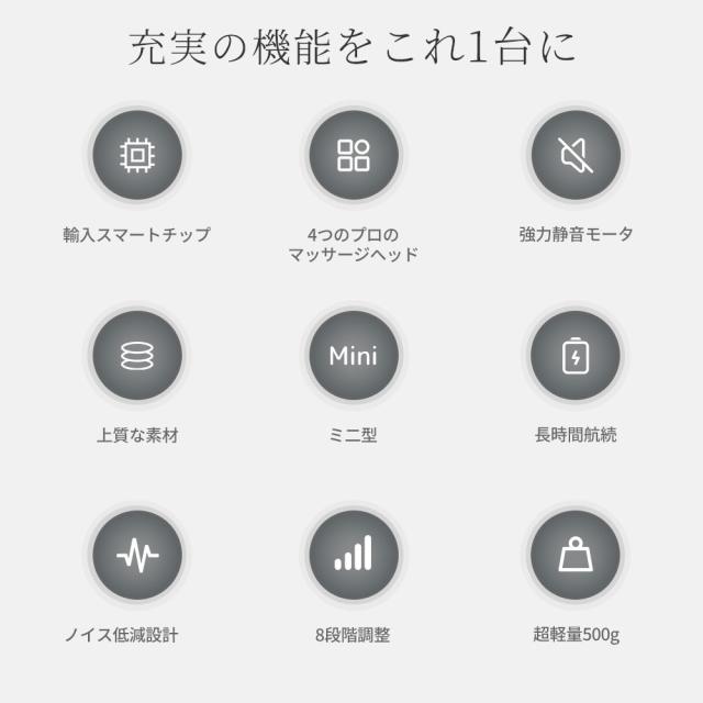 コンパクトなのにパワフルさを維持しつつ、 本体が約509gの"マッサージガン"なので、片手でラク〜に使えて"マッサージの代用"にピッタリです。