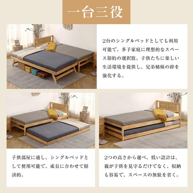 【一台三役】: 一役:この子供用ベッドは2つの高さから選べ、低い設計は、親が子供を見守るだけでなく、収納も容易で、スペースの無駄を省く。二役: 子供部屋に適し、シングルベッドとして使用可能で、成長に合わせて経済的。三役: 2台のシングルベッドとしても利用可能で、多子家庭に理想的なスペース節約の選択肢。子供たちに楽しい生活環境を提供し、兄弟姉妹の絆を強化する。