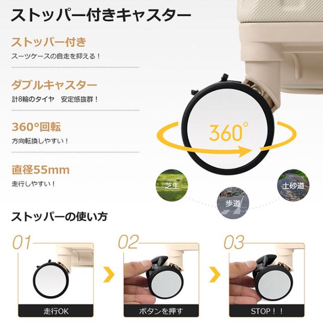 【ストッパー付き&大型ダブルキャスター】段差や石畳の走行に強いWキャスターは360°どの方向にも安定感があり、スムーズな走行が可能です。 ?ストッパー付き?ダブルキャスター?360°回転?50mmの大型キャスター