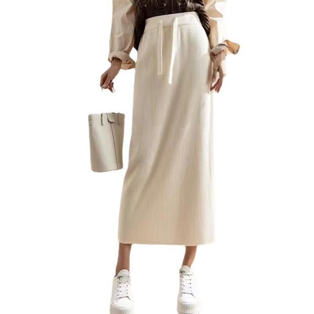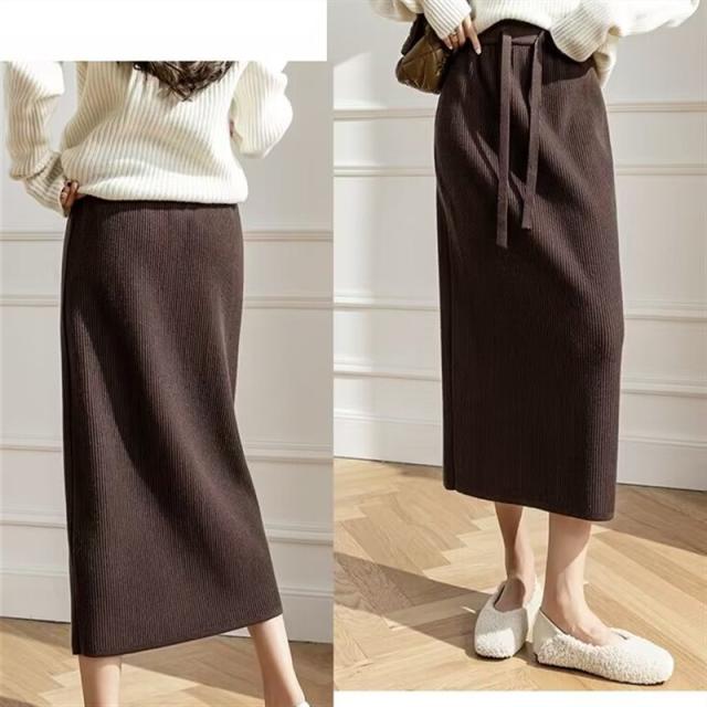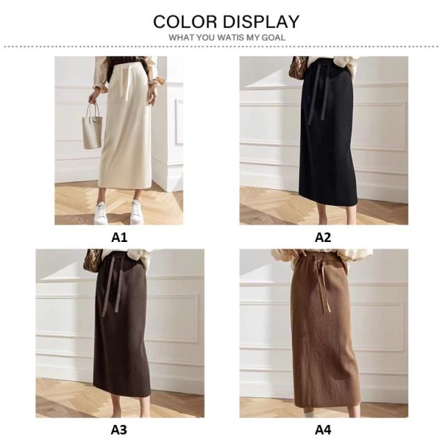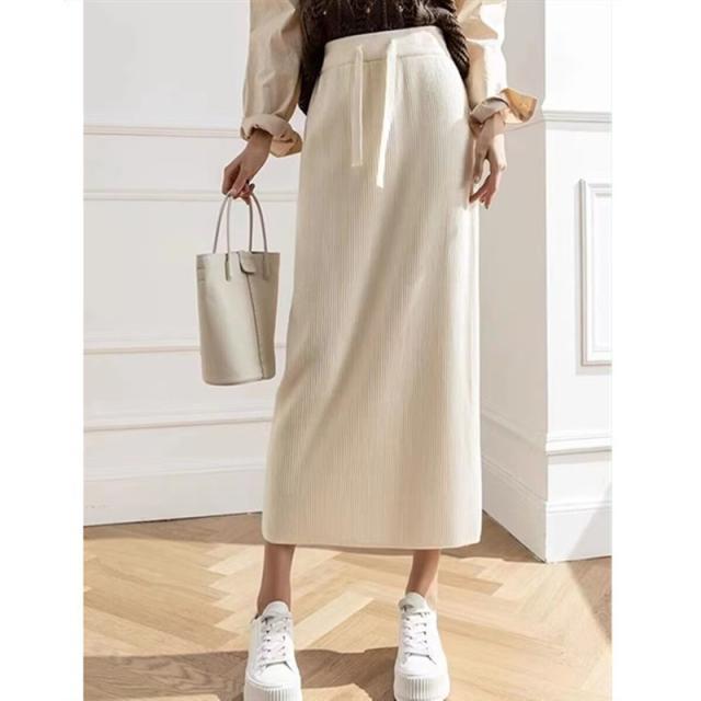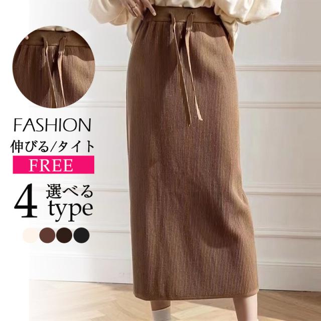 スカート ニット ロング タイトスカート 秋冬 Aライン ウエストゴム 紐 タイト ロング ミモレ丈 ひざ丈 マキシ丈 無地