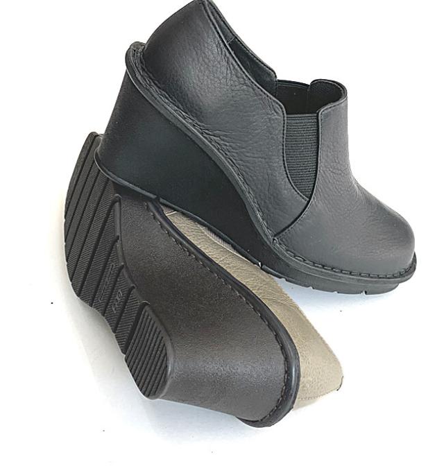 履き口のゴムを長めに取っているので脱ぎ履きラクラクです。素材はしっとりとしたとても柔らかなラム調アンチック素材を使用しています。ヒールの高さは約7.5cm。しっかりした厚底ウェッジで、高さがあっても安定感の感じられる履き心地です。