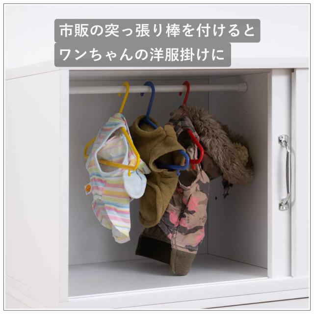 市販の突っ張り棒を取り付け、ペットケージの上にセットすれば、ワンちゃん用のミニクローゼットとしてアレンジ可能です。