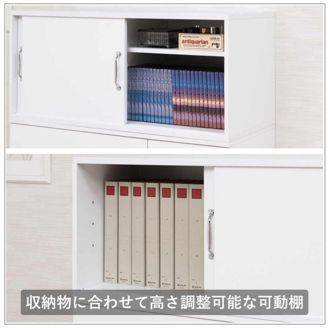 左右にそれぞれ1枚ずつ可動棚が付いているので、収納物に合わせて高さを調整できます。小物やDVD、A4サイズのファイルなどの収納にお使いいただけます。