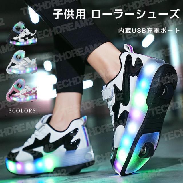 ローラーシューズ スニーカー 子供 2輪 led 7色照明 ローラーシューズ子供用 ローラースケート かかとボタン ヒーリーズ 23cm 男の子 女の子 USB充電式