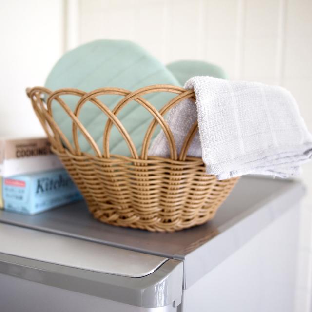 デザイン性と実用性を兼ね備えた、透かし編みが美しいポリエチレン素材を使用したバスケットです。天然素材特有のささくれもなく、丈夫で壊れにくいです。天然素材のバスケットの中でも高級とされているラタン素材をリアルに再現しているので、ナチュラルで上品な雰囲気を楽しめます。小ぶりながら深さもあり、ダイニングテーブルの上などで、ちょっとした小物を収納するのに役立ちます。