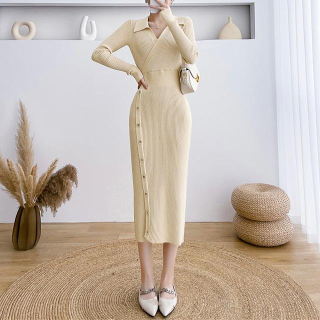 カシュクールネックがオトナ女子のお色気を演出しながら、膝まで隠れる上品な丈感でエレガントな淑女風の装いになる韓国DESIGNの新作リブ編みニットワンピース