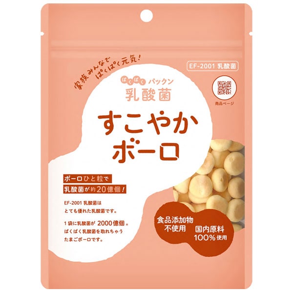 1袋にEF-2001乳酸菌が2000億個(ひと粒で約20億個(ヨーグルト2個分相当))入ったたまごボーロです。素材にこだわり、安心安全な国内材料を100%使用し、国内工場で丁寧に作りました。